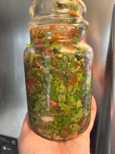 Finely chop 3-4 Serrano Chilis to make 2 tbsp of chili